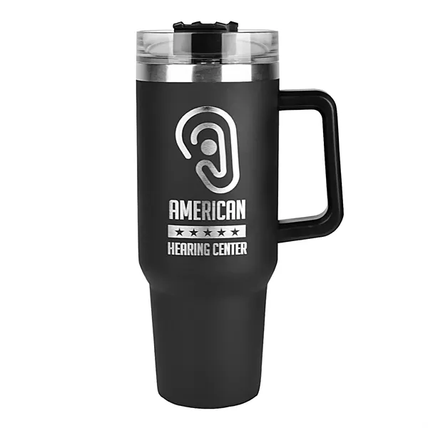 Your new best friend. This 40 oz double wall vacuum insulated tumbler with an ergonomic handle is the ideal companion for all your beverage needs. Stay hydrated from a great work out at the gym, a fun outdoor adventure, or enjoy a nice hot beverage sitting around the fire, The Forty will hold the right temperature for you for hours. Constructed of premium stainless steel, this rugged piece will be your go to solution for years to come.