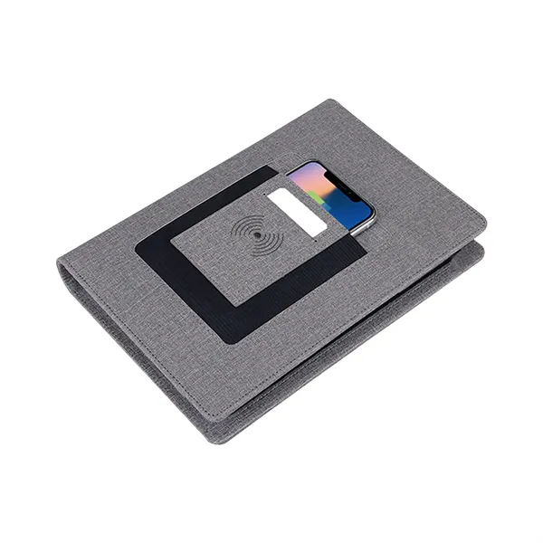 This charging notebook is the ultimate solution for staying organized while keeping your devices powered. It features a built-in wireless charging pad, along with a pop-up USB port for added convenience. The sleek padfolio also includes a 4-slot card holder for business, bank, or debit cards, an elastic pen loop, a smartphone stand, and a replaceable A5 lined notebook to keep you on track. Perfect for business professionals, this custom power bank notebook makes an exceptional gift.